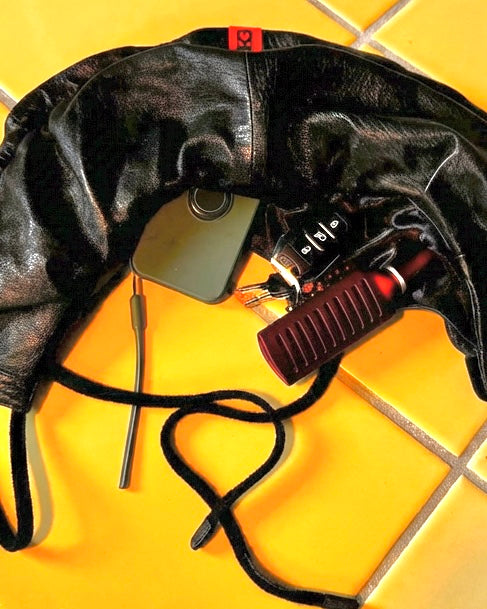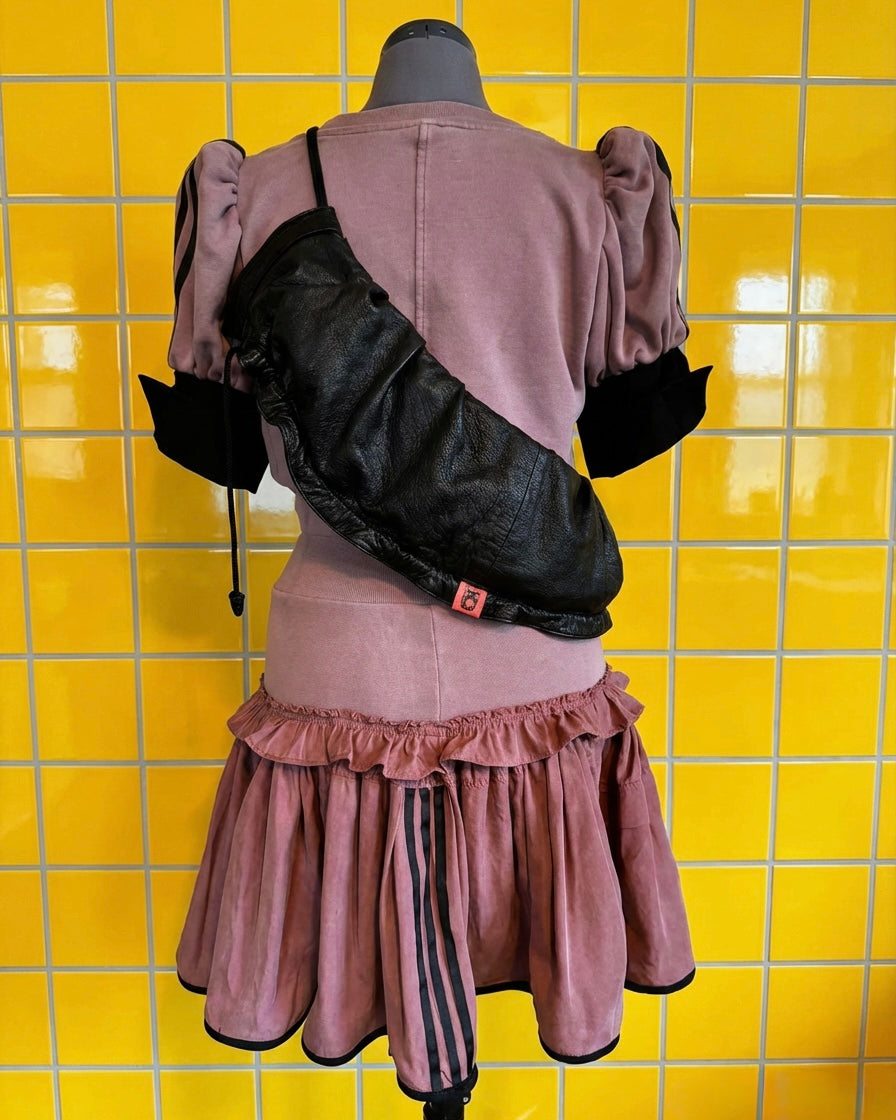 The statement collar/bag is the hero piece. Made from soft, supple leather and fully lined in smooth black silky fabric, it fastens with a concealed zip for a clean finish. The original sweatshirt tie has been reworked into an adjustable strap, allowing it to be worn multiple ways — as a collar, crossbody bag or styling accessory.