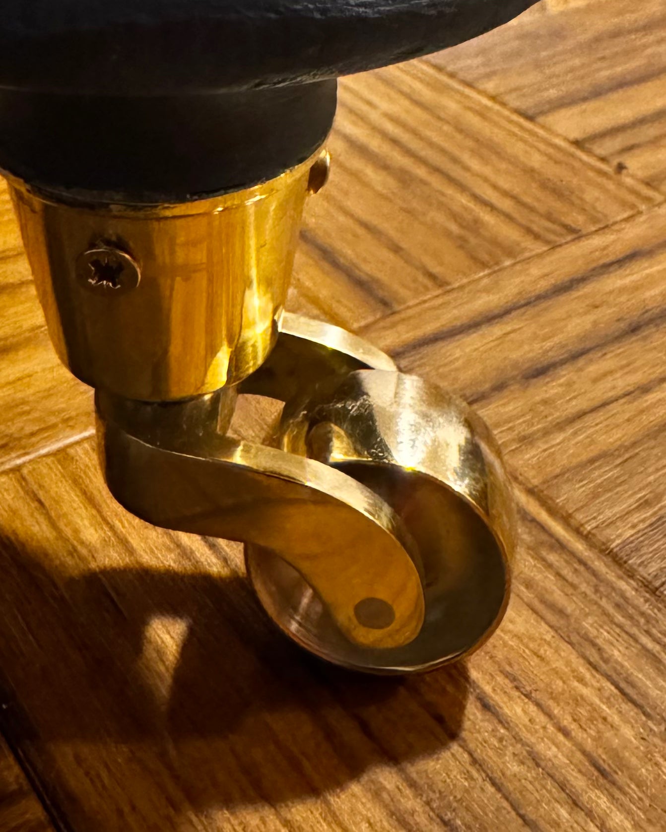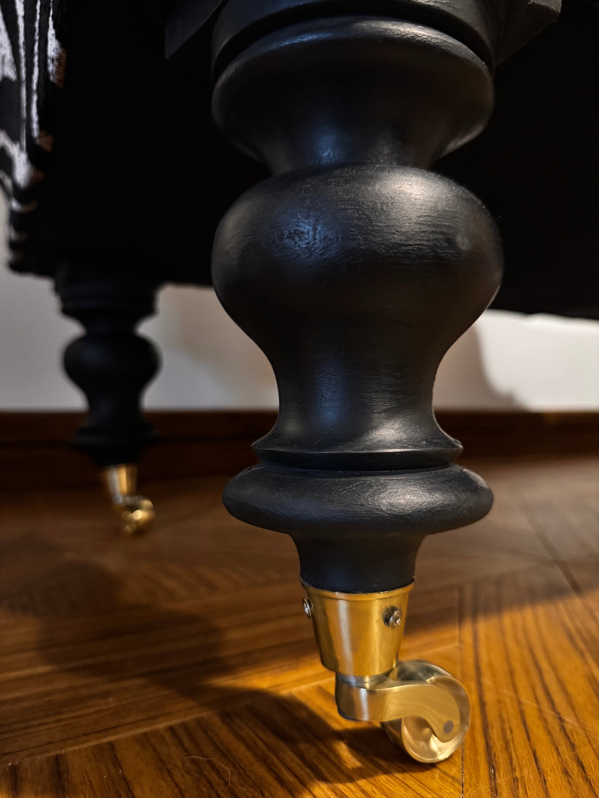 The restored frame is finished in deep black with smart gold castor wheels for smooth movement. Its traditional sprung base offers exceptional comfort, and it comes complete with a coordinating bolster cushion.